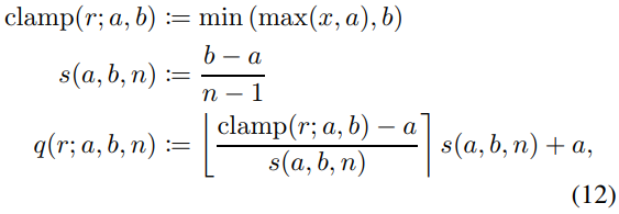 - For each layer, quantization is parameterized by the number of quantization levels and clamping range, and is performed by applying point-wise the quantization function q defined as follows: